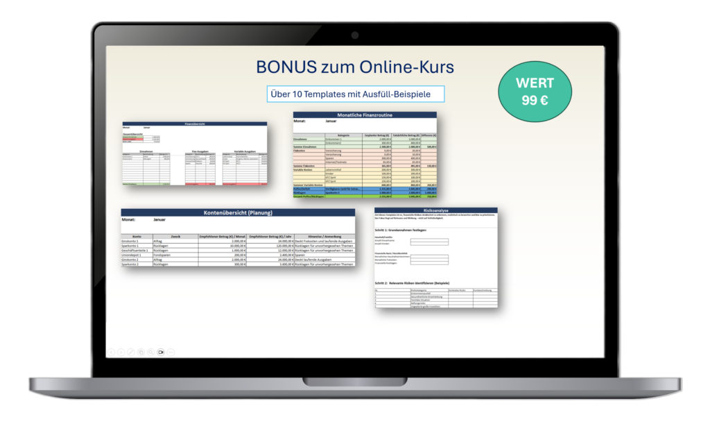 Als Bonus erhältst du kostenlos zu jedem Modul Excel-Templates und zusätzliche Druckversionen in PDF. Außerdem gibt es verschiedene Workbooks und Anleitungen (Wert: 99 €)