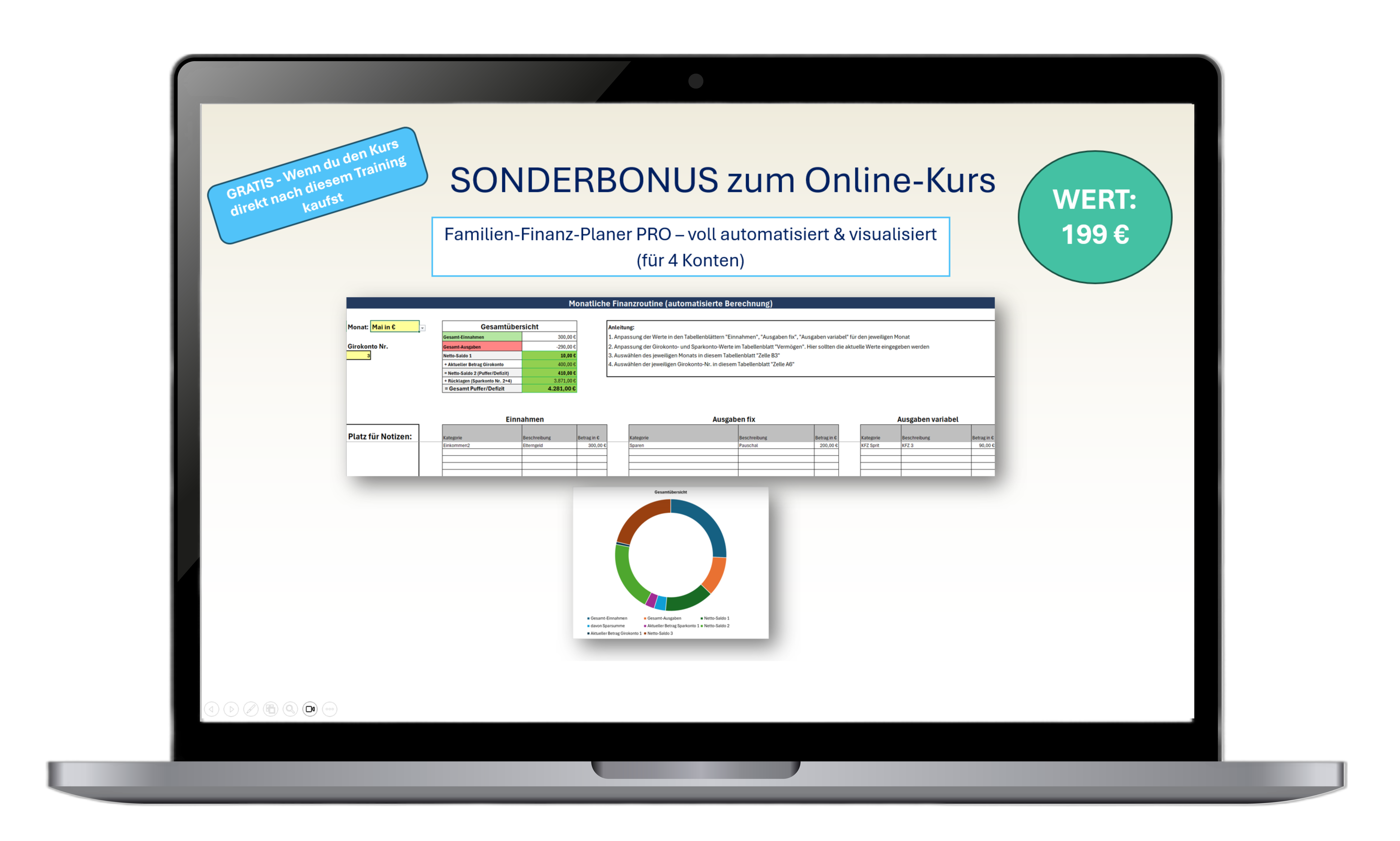 Zusätzlich habe ich als Sonderbonus den automatisierten Familien-Finanz-Planer PRO entwickelt, welchen du ebenso kostenlos beim Kauf des Kurses erhältst (Wert: 199 €).